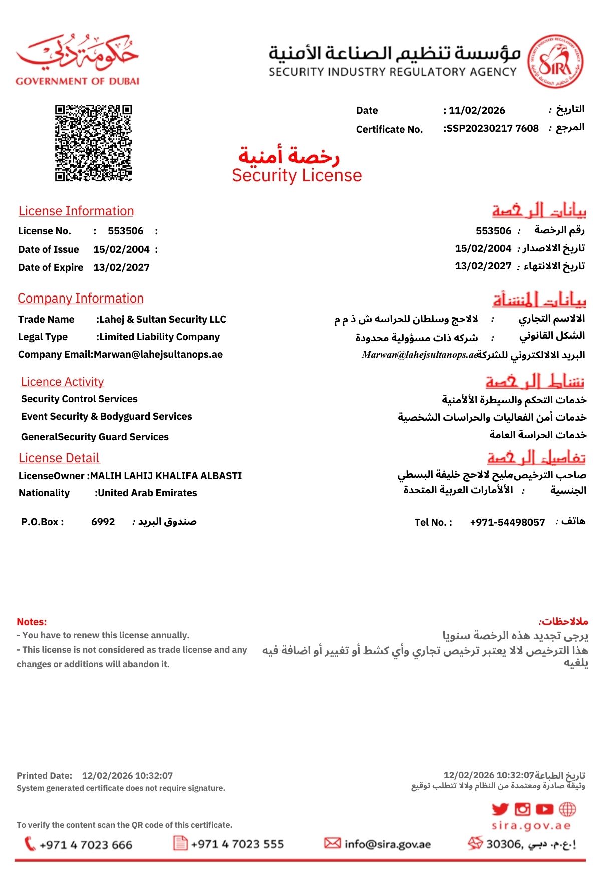 SIRA Registration Certificate